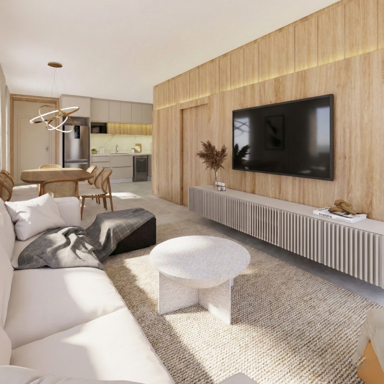 Neste living, o grande protagonista é o painel em madeira que percorre a parede principal. Além de abrigar a TV, ele esconde portas de passagem (mimetizadas), criando um visual limpo e sofisticado. O rack ripado suspenso alonga o ambiente, enquanto a paleta de cores neutras garante que a luz natural seja aproveitada ao máximo. Um projeto onde a marcenaria não é apenas estética, mas uma solução funcional para organizar e ampliar o espaço.